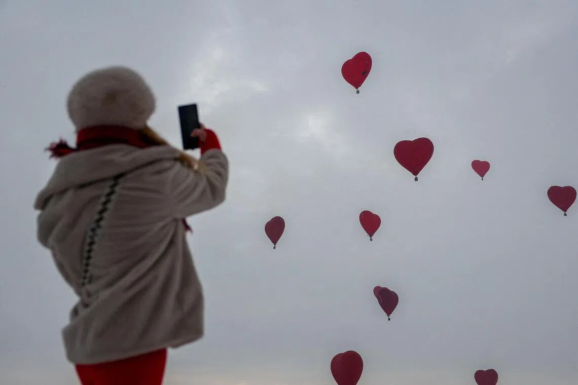 A participant taking pictures of hot air balloons floating in the sky during the Festival of Hearts 2026 hot air ballooning event, organised by the Aerowaltz club in Moscow, Russia.