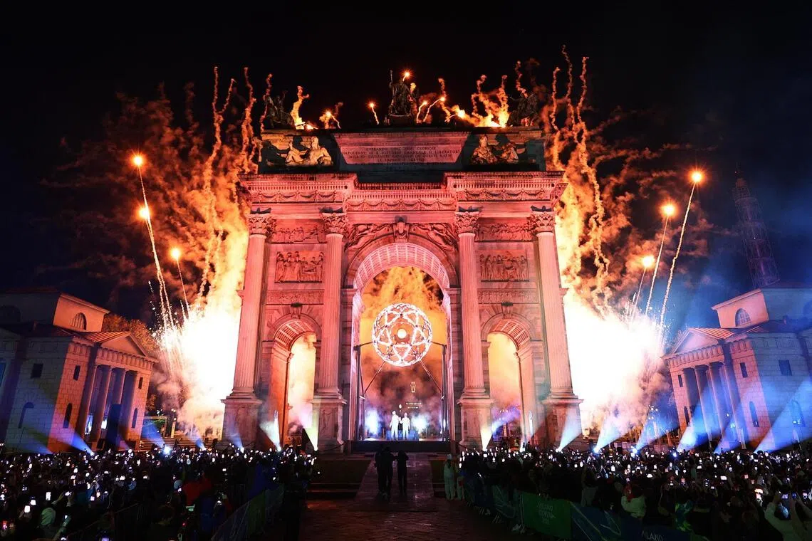 Fireworks lighting up the night sky as the Olympic cauldron under the Arco della Pace in Milan is lit by Alberto Tomba and Deborah Compagnoni during the opening ceremony of the Milano Cortina 2026 Winter Olympics.