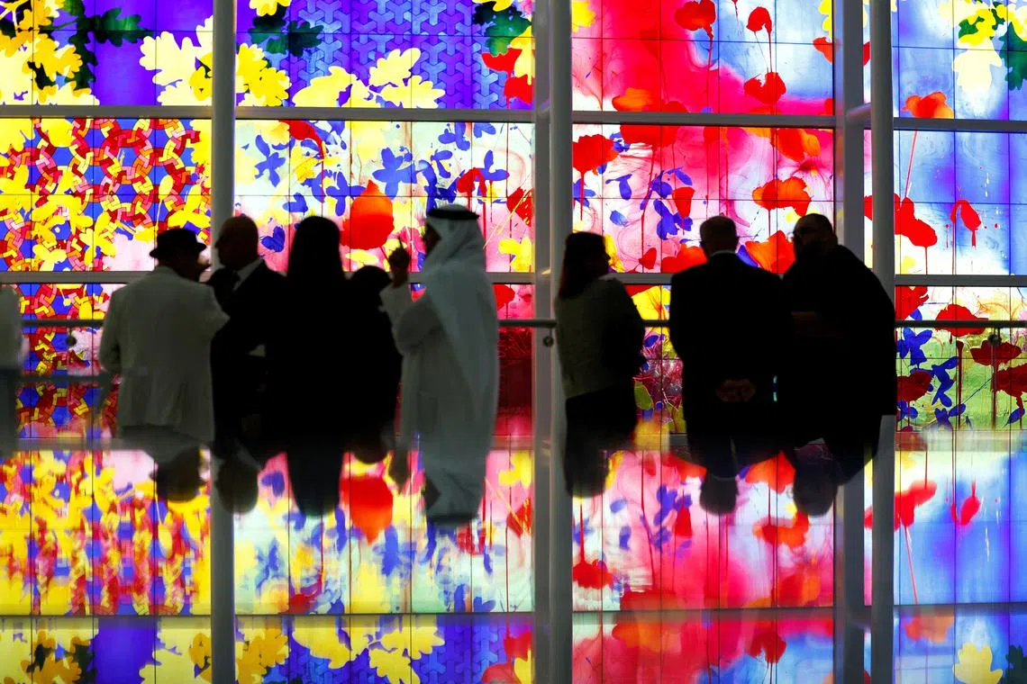 People stand in front of the 34-meter-wide by 17-meter-high stained-glass art installation by British artist Sir Brain Clarke during the unveiling ceremony at the Bahrain International Airport, in Muharraq, Bahrain on April 10, 2025.