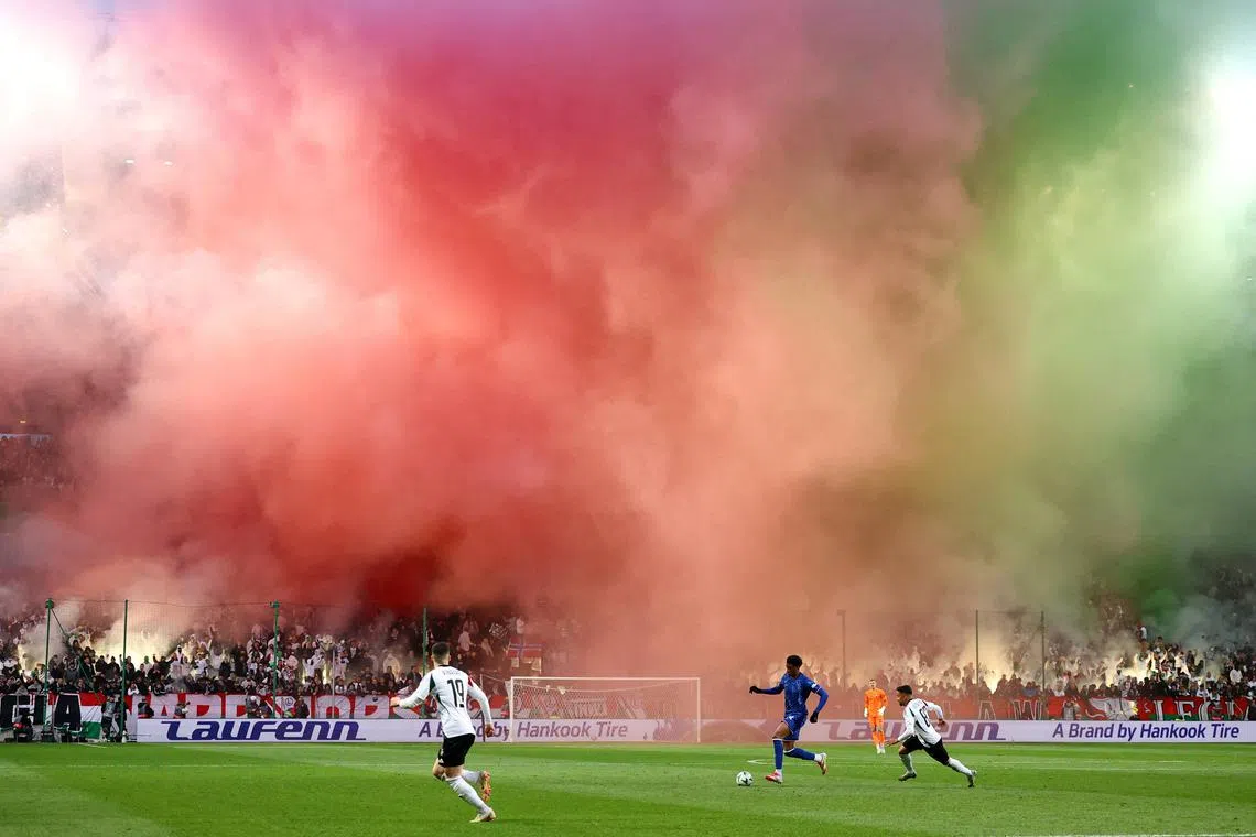 Colourful smoke from Legia Warsaw fans' flares filling the Stadion Wojska Polskiego during the Conference League match between Legia Warsaw and Chelsea in Warsaw, Poland on April 10, 2025.