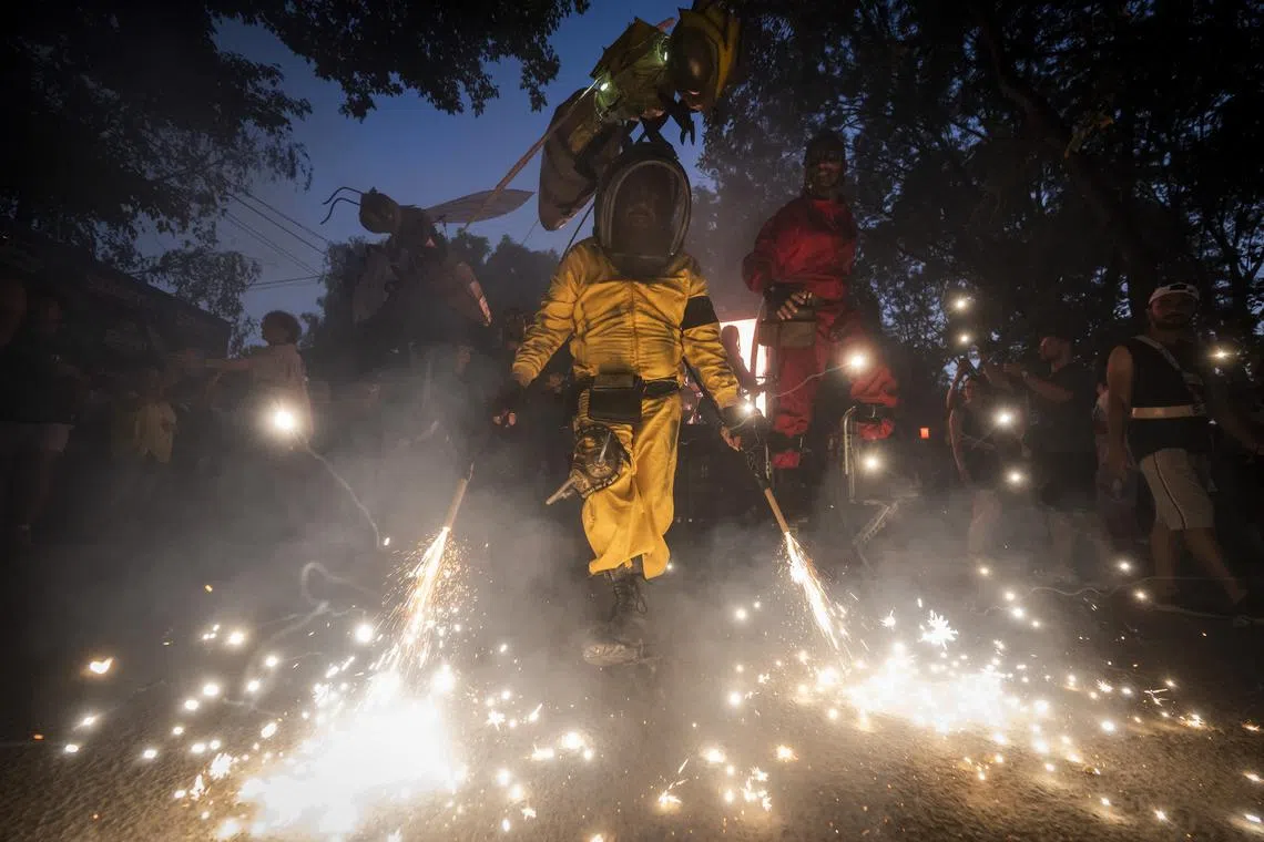 Members of a street theatre group presenting a show at the 31st Sziget Festival on Shipyard Island in Budapest, Hungary, on Aug 9, 2025.