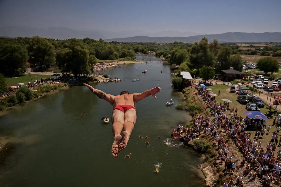 A diver jumping from a 22m-high bridge into the White Drin river during a traditional high diving competition near the city of Gjakova, Kosovo, on Aug 10, 2025.