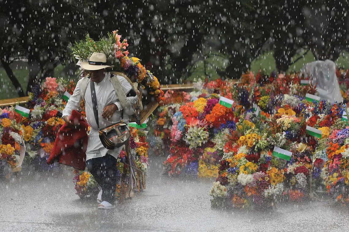 A farmer carrying a flower arrangement known as silletas during a traditional Silleteros parade, held as part of the Flower Festival, in Medellin, Colombia, on Aug 10, 2025.