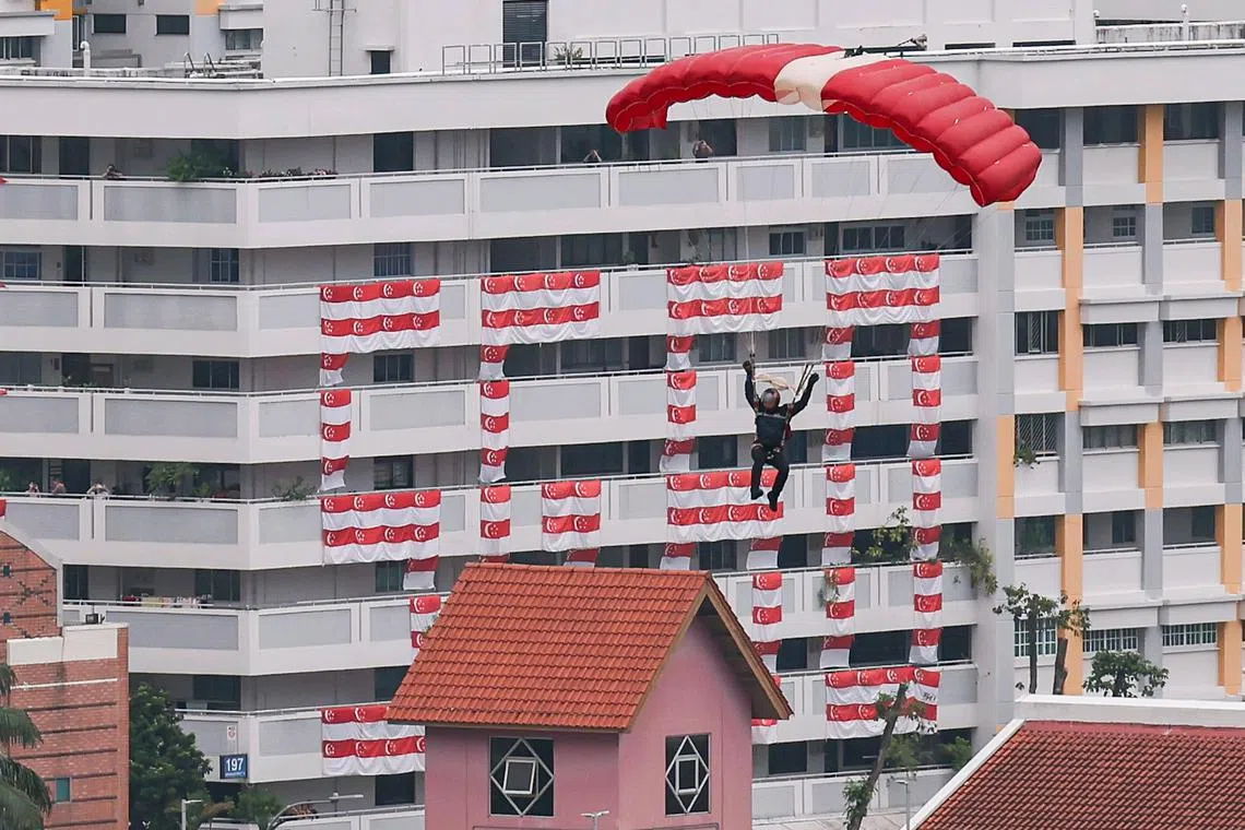 A Red Lion parachutist approaching an open field beside Junction 8 in Bishan, as part of 2025 National Day heartland festivities on Aug 10, 2025. The Red Lions team is best known for its free-fall displays at the annual National Day Parade.