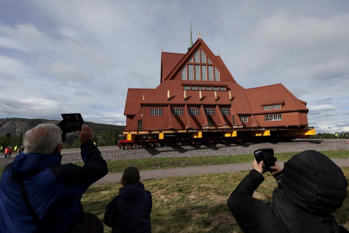 Kiruna’s old wooden church being moved during a two-day relocation trip to a new site next to a cemetery, to save its wooden walls from ground subsidence and the expansion of the world’s largest underground iron ore mine, in Kiruna, Sweden, on Aug 19, 2025.