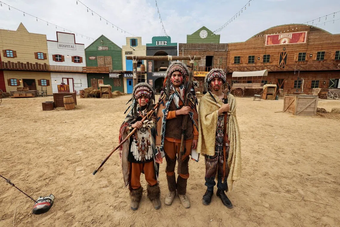 Saudi youth dressed as Native Americans posing for photos at Cowboy Town, an entertainment park where visitors can experience cowboy culture, in Abha, Saudi Arabia, on Aug 18, 2025.