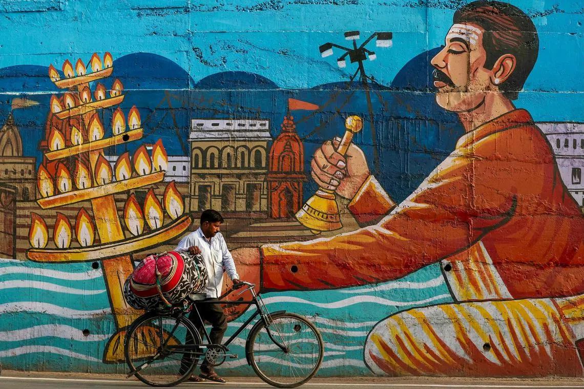 A man carrying a bundle of clothes on his bicycle and walking past a wall mural in Varanasi, India, on Aug 19, 2025.