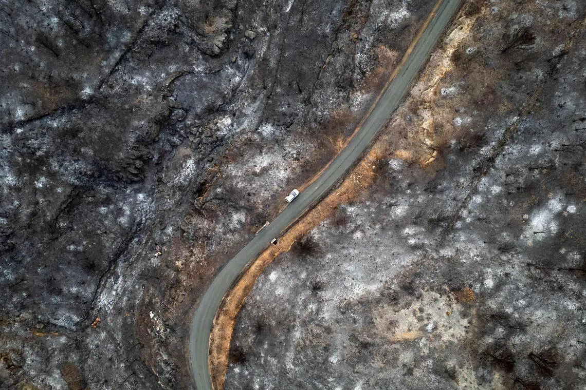 An aerial view of a road running through land scorched by wildfires near the village of Jonquieres, in the Aude department of southern France, on Aug 18, 2025.