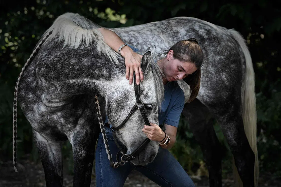 This photograph released on Aug 20, 2025, shows French osteopath Philippine Jean performing animal osteopathy on a horse in Ayguemorte-les-Graves, south-western France.