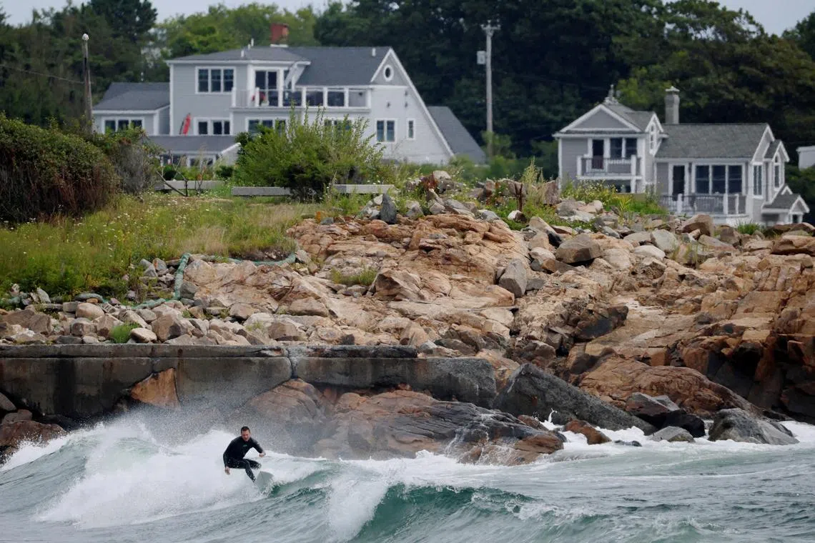A surfer taking advantage of the waves and wind from Hurricane Erin, the first hurricane of the 2025 Atlantic season, in Rockport, Massachusetts, US, on Aug 21, 2025.