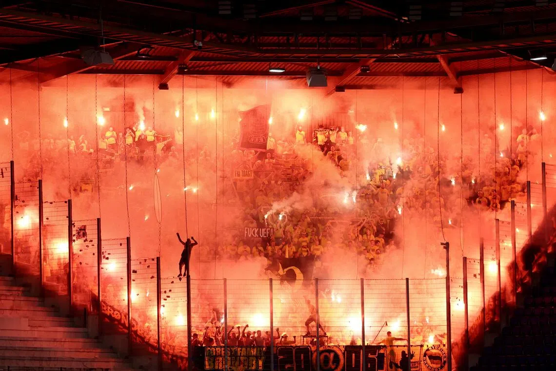 Brondby IF fans with flares waiting for the Uefa Conference League football match with RC Strasbourg inside Stade de la Meinau in Strasbourg, France, on Aug 21, 2025.