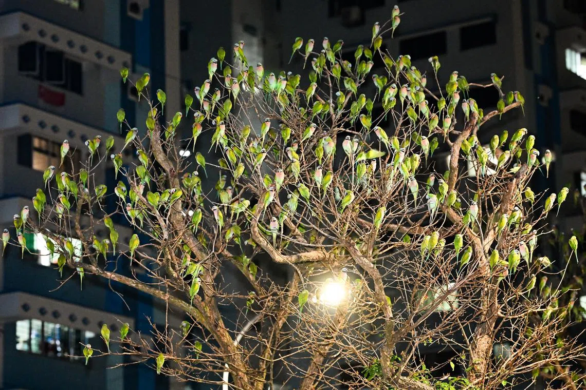 Red-breasted parakeets are seen perched on a tree between Block 415 Choa Chu Kang Avenue 4 and Block 352 at Choa Chu Kang Central in Choa Chu Kang Way on Aug 20, 2025. Red-breasted parakeets were introduced here in the 1940s through the pet trade and their population has become self-sustaining, with local breeding recorded. To date, they can be found in parks, gardens and scrubland across Singapore.