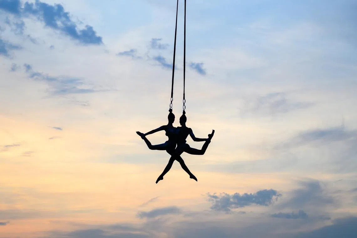 Aerialists of the Hungarian troupe Vincze Tunde Production performing on the opening night of Strand Festival in Zamardi on Aug 20, 2025.