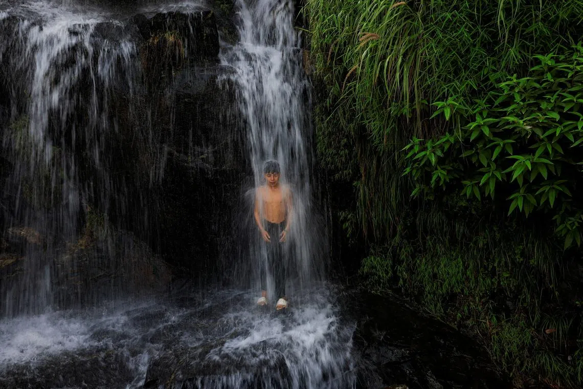 A boy cooling off under a waterfall on the outskirts of Sowari, in Buner District, in Khyber Pakhtunkhwa province, Pakistan, on Aug 20, 2025.