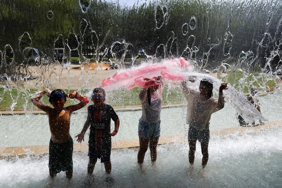Children cooling off at a park fountain in Tokyo as the Japanese government issued a heatstroke alert in the capital and other prefectures during a heatwave, on Aug 4, 2025.