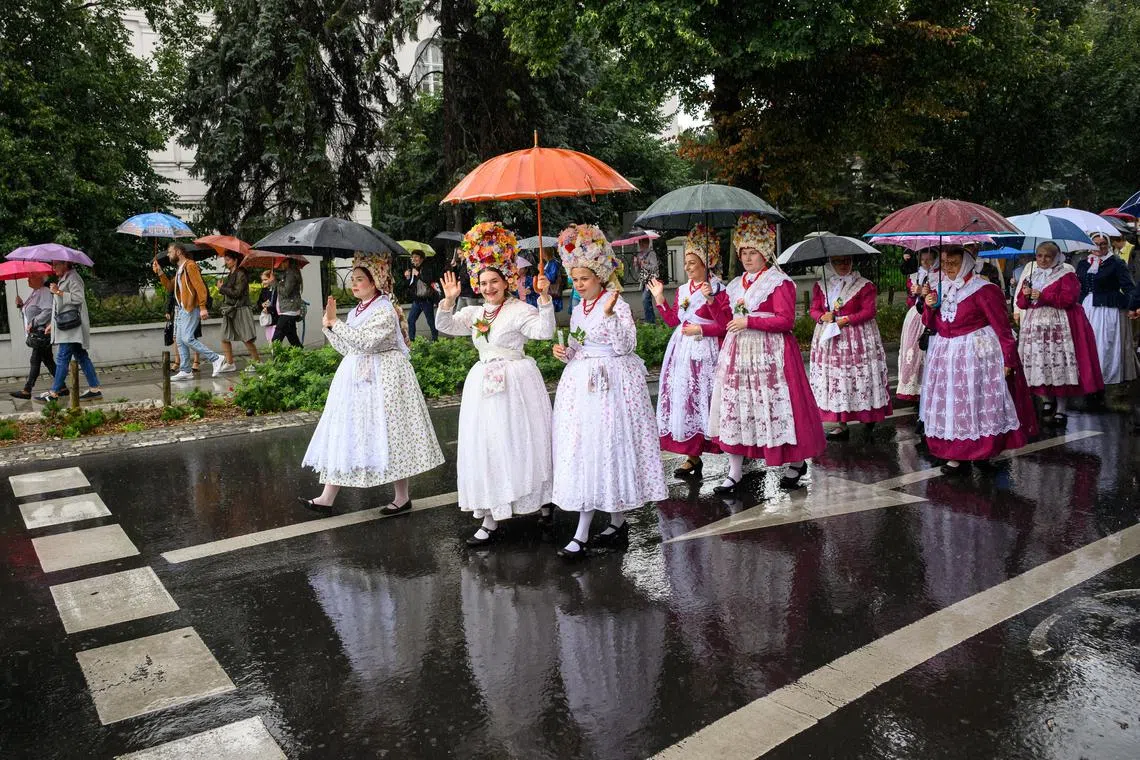 Poznan residents taking part in the 30th Bamberg Festival, held as part of the Poznan Traditions Festival to mark the 306th anniversary of the arrival of settlers from Bamberg, Germany, in Poznan, Poland, on Aug 3, 2025.