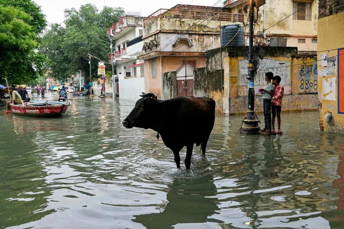 A cow standing in a flooded street after heavy monsoon rain raised the water level of the Ganges River in Varanasi, India, on Aug 4, 2025.