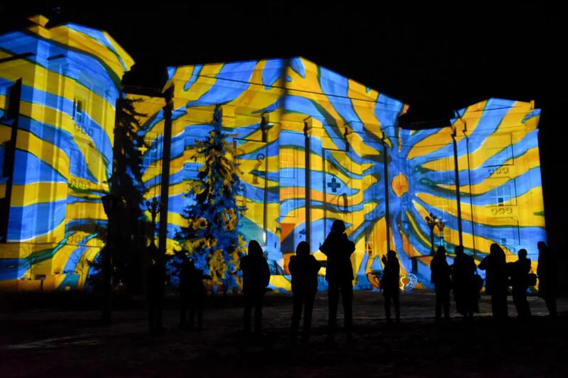 People watch the National Historical Museum illuminated by Swiss light artist Gerry Hofstetter in Kyiv, Ukraine. PHOTO : EPA-EFE