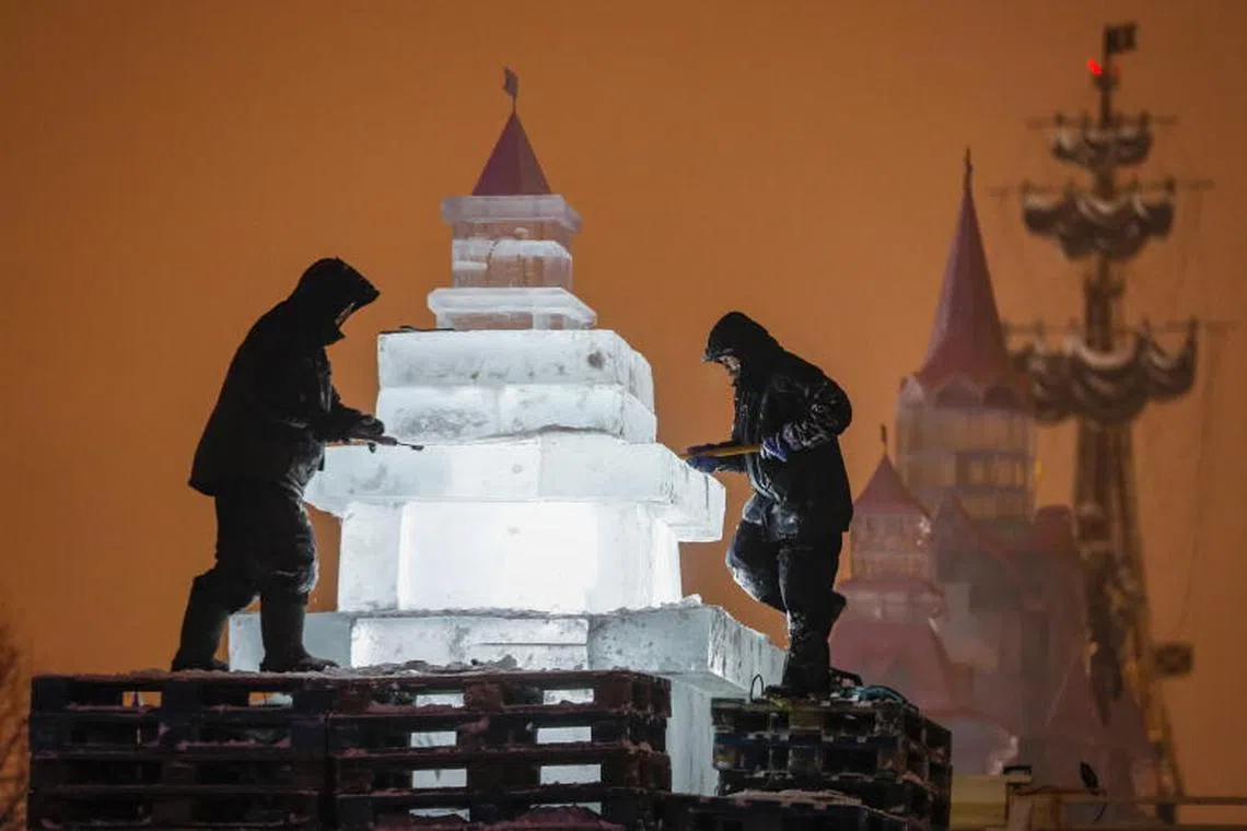 Sculptors work on an ice sculpture at the Snow And Ice In Moscow festival in Muzeon park on Dec 28, 2022. The theme this year is Wonders and Heritage of Russia and sculptures go up to 7m high. PHOTO : EPA-EFE