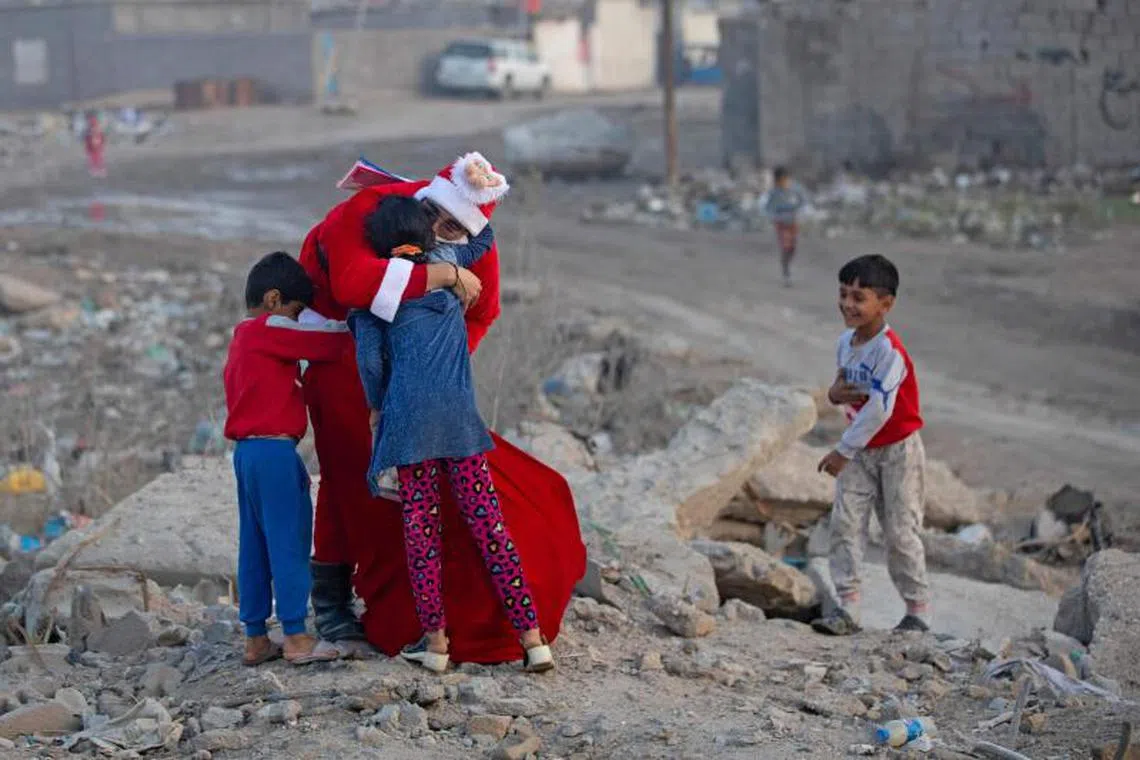 Mohamed Maarouf, dressed as Santa Claus, distributes gifts to children living in a slum in Iraq's southern city of Basra. PHOTO : AFP