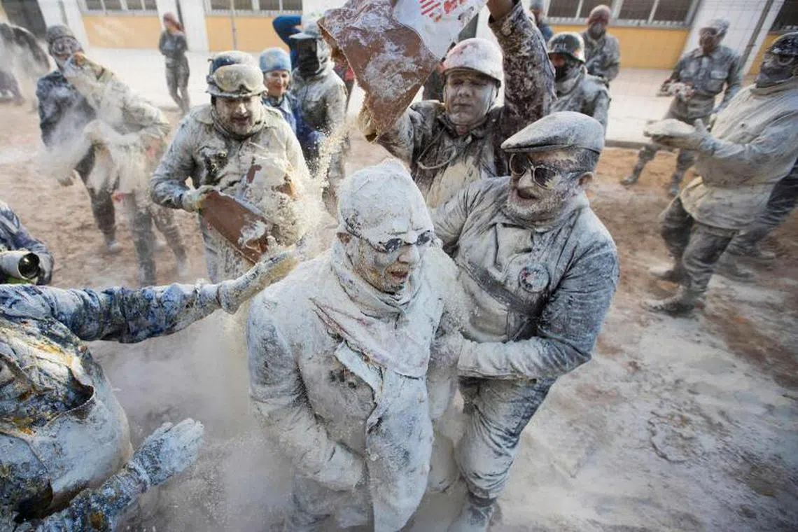 Revellers dressed in mock military garb take part in a food battle in the Spanish town of Ib. In this 200-year-old tradition, participants, known as Els Enfarinats (those covered in flour), stage a mock coup d'etat as they battle with flour, eggs and firecrackers outside the city town hall. PHOTO : AFP