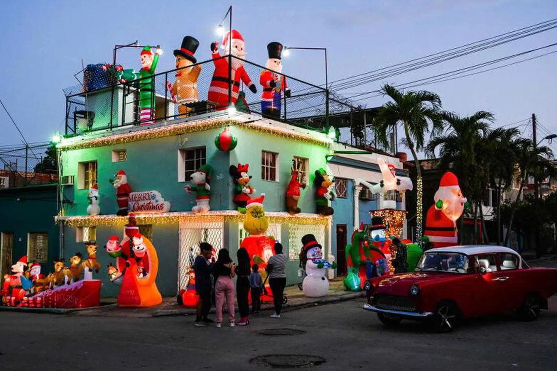 People stand outside a house with Christmas decorations in Havana, Cuba on Dec 28, 2022. PHOTO : AFP