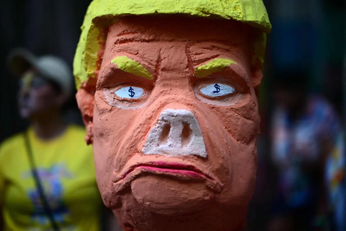 A puppet depicting US President Donald Trump pictured during a parade of the street carnival group Loucura Suburbana (Suburban Craziness) in the suburbs of Rio de Janeiro, Brazil, on Feb 27, 2025.