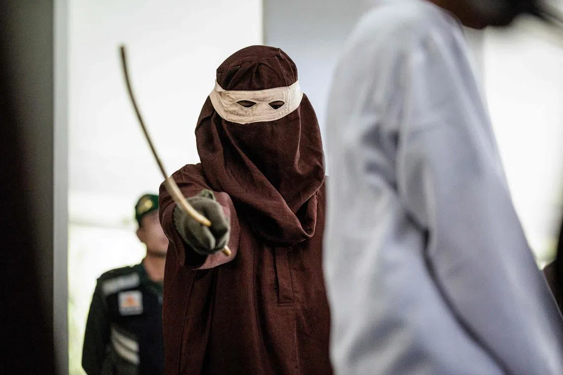 A man being publicly flogged in Banda Aceh, Indonesia, on Feb 27, 2025. He was found guilty of sexual relations with another man under strict Islamic sharia law.