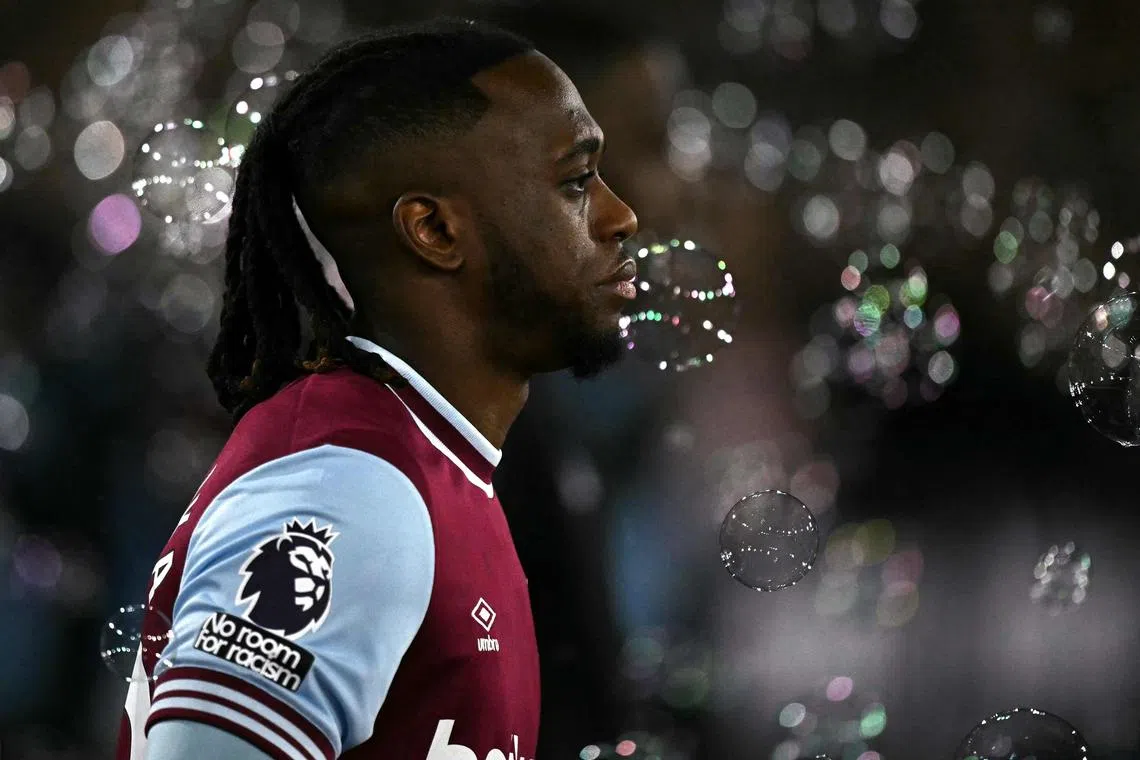 West Ham United defender Aaron Wan-Bissaka walking through bubbles blown by fans before the English Premier League football match between West Ham United and Leicester City at the London Stadium, in London, Britain, on Feb 27, 2025.