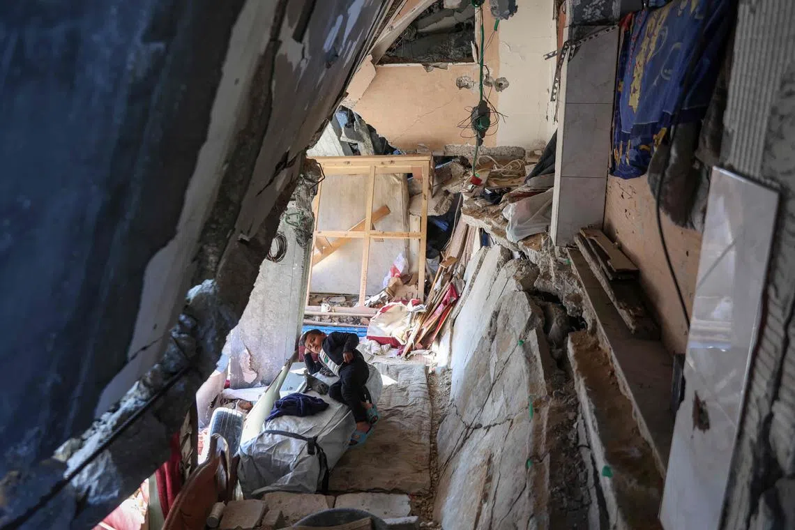 A Palestinian child resting in a destroyed building in Jabalia, in the northern Gaza Strip, on Feb 27, 2025, amid the ongoing truce between Israel and Hamas.