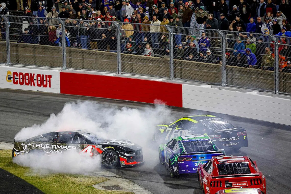 A race car spinning after an on-track incident during the qualifying heat for the Cook Out Clash at Bowman Gray Stadium on Feb 1, 2025, in Winston-Salem, North Carolina.