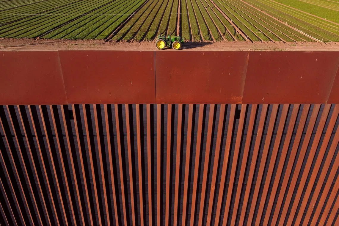 A drone view showing a tractor at a field in Calexico, California, behind the wall on the US-Mexico border, as seen from Mexicali, Mexico, on Jan 14, 2025.