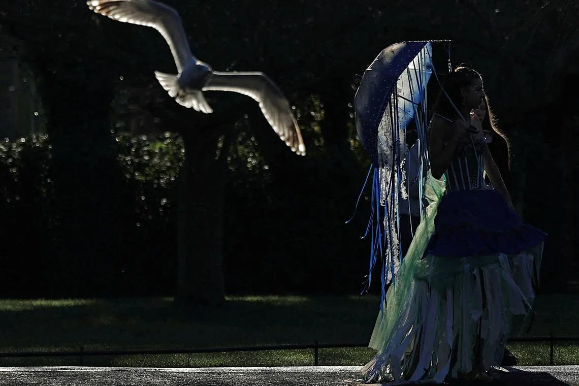 A woman is seen wearing a fancy dress costume and carrying an umbrella in St Stephen's Green in Dublin, Ireland, as a bird flies past her on Jan 15, 2025.