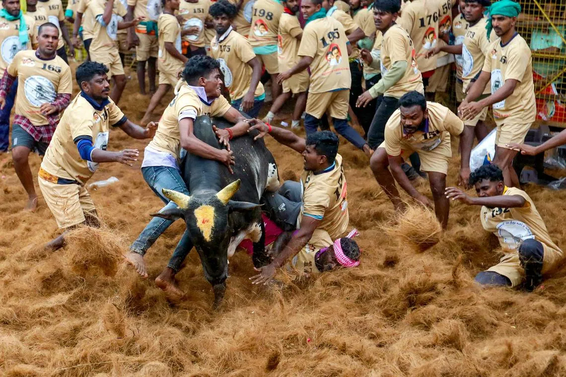 Villagers trying to control a bull during an annual bull-taming festival called Jallikattu in Palamedu village, India, on Jan 15, 2025. The traditional but controversial sport is practised in Tamil Nadu as part of Pongal celebrations in January.