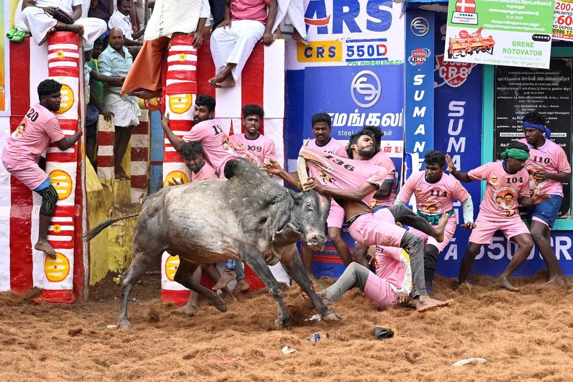 A villager is pinned by a bull as he tries to control the bull during a bull-taming festival, known as "Jallikattu", which is a part of south India's harvest festival of Pongal, on the outskirts of Madurai town on Jan 16, 2025.
