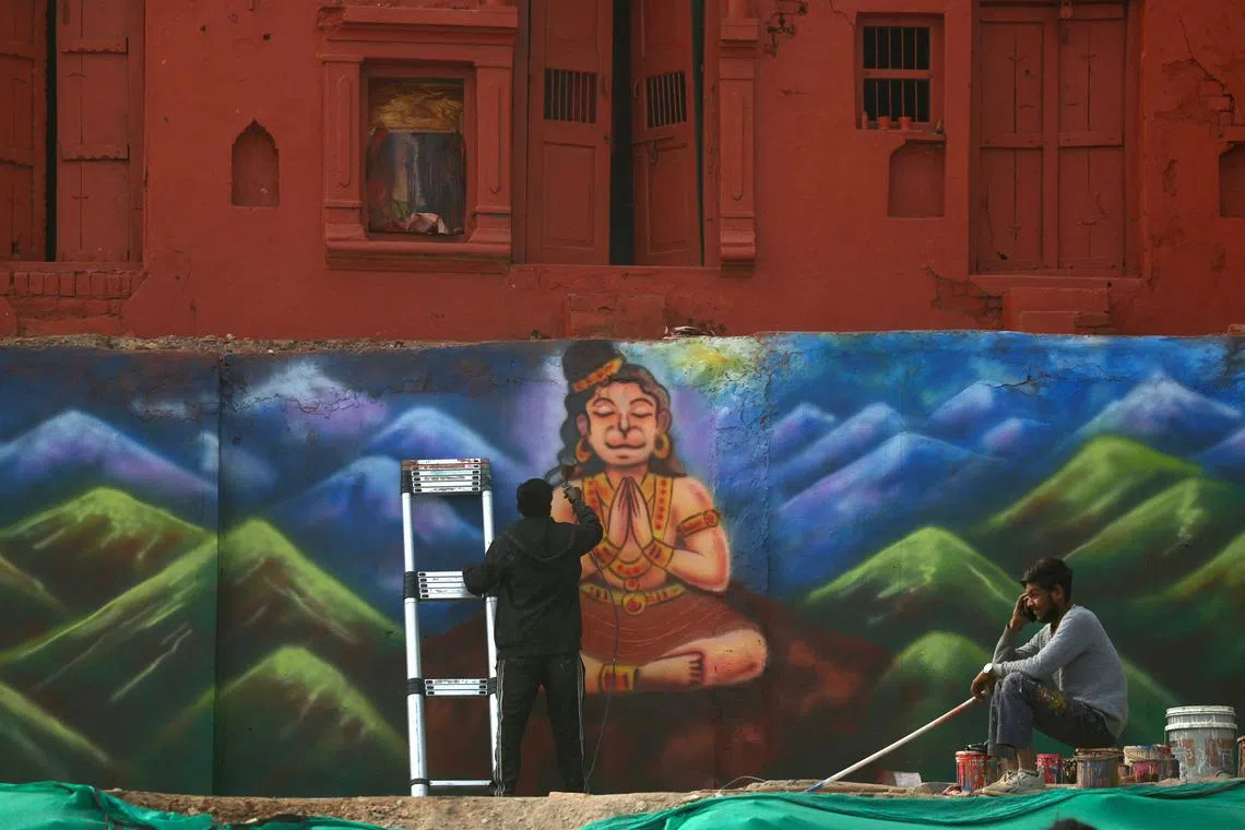 A worker painting a mural of monkey god Hanuman on a wall during the Maha Kumbh Mela festival, near Sangam, the confluence of Ganges, Yamuna and mythical Saraswati rivers, in Prayagraj, India, on Jan 16, 2025.