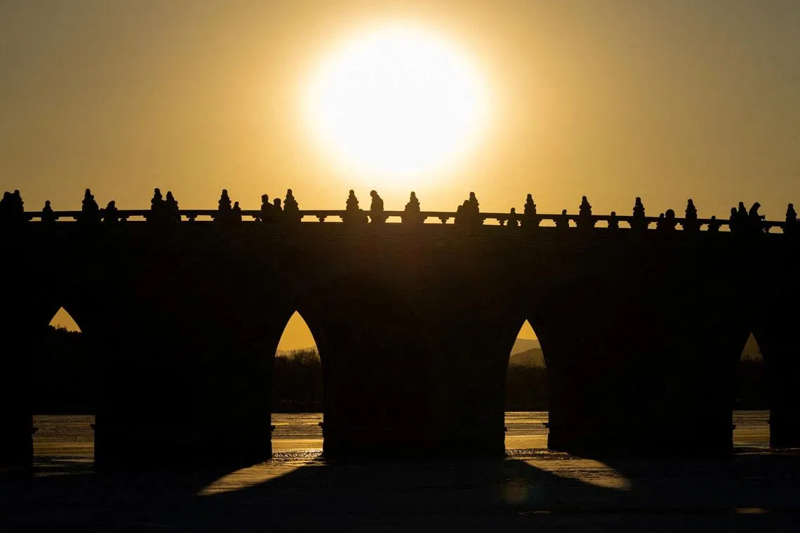 People walking along the Seventeen-Arch Bridge, also known as Shiqikong Qiao, as the sun sets at the Summer Palace in Beijing, China, on Jan 20, 2026.