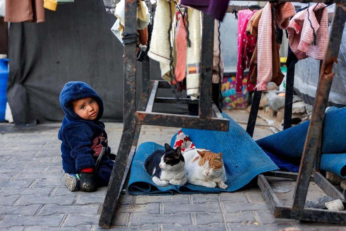 A toddler resting beside cats lying on a mat at a camp for people displaced by the conflict in Gaza City on Jan 28, 2026. Since Oct 10, a fragile US-sponsored truce has largely halted the fighting between Israeli forces and Hamas, though both sides have alleged frequent violations.