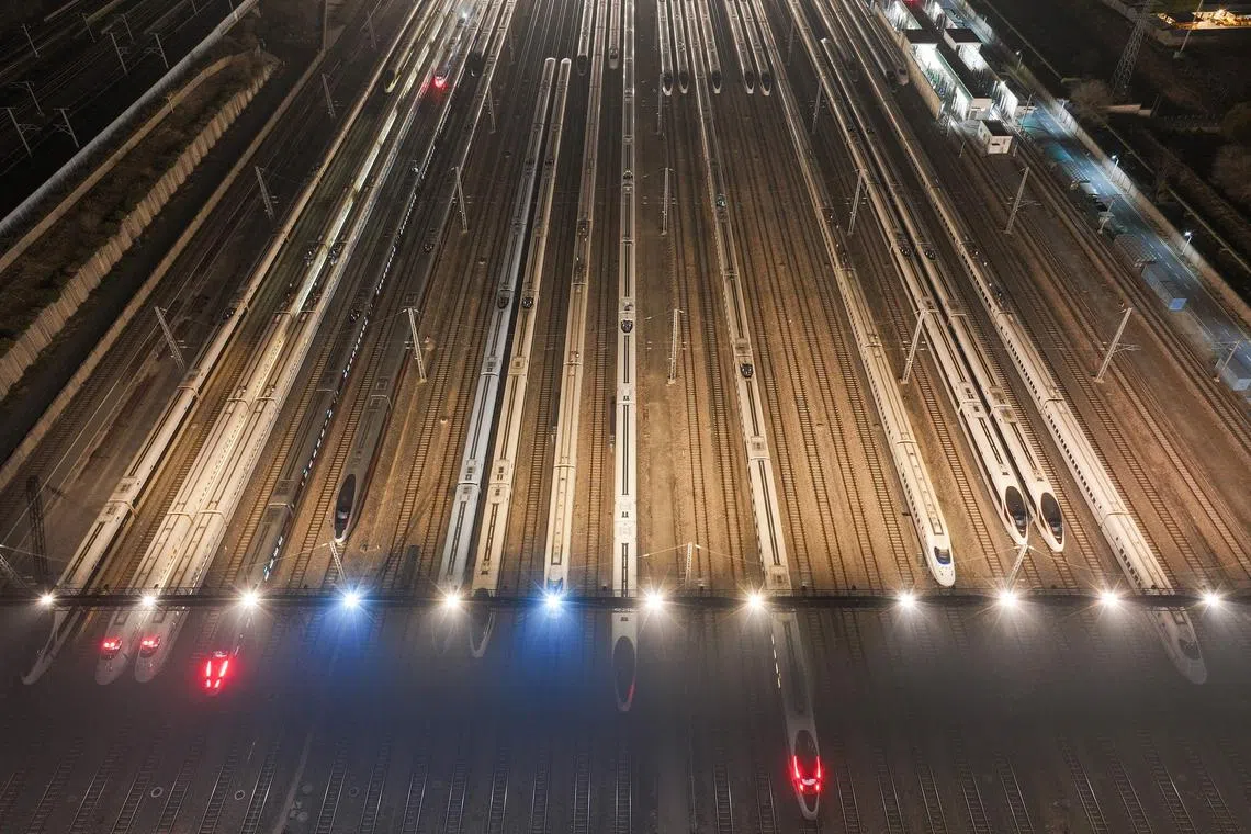 High-speed trains on stabling tracks in Nanjing, China's Jiangsu province, on Jan 2. China aims to expand the length of its operating high-speed rail tracks to around 60,000km by 2030, up from 48,000 km at the end of 2024.