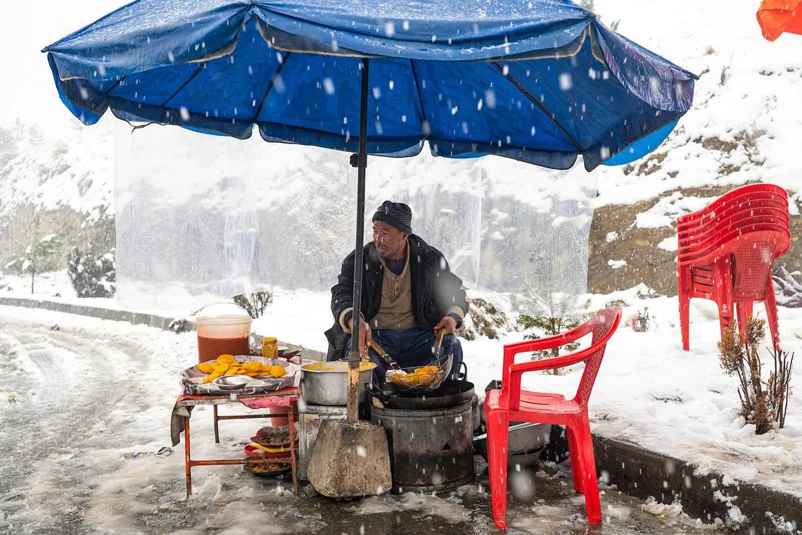 An Afghan street vendor prepares local fritters known as pakawra during the first heavy snowfall this winter in Kabul, Afghanistan, on Jan 2.