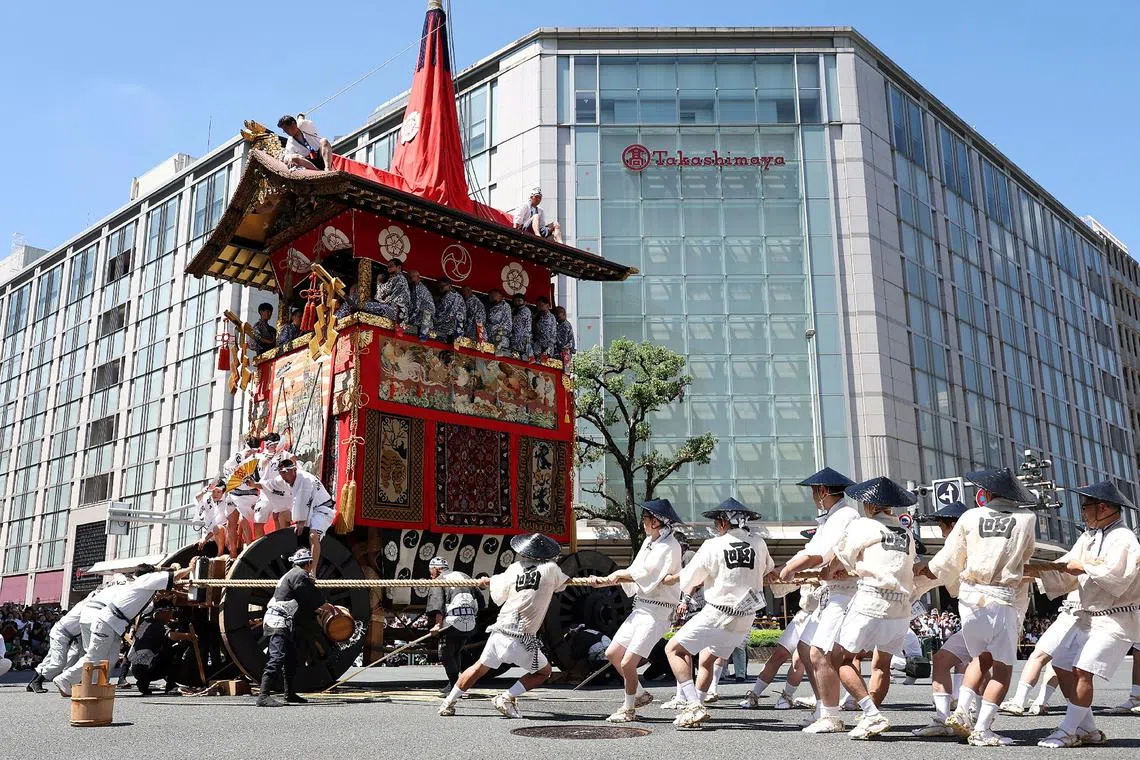 Participants pulling a giant float through the streets during the "Yamaboko Junk", or first float procession, at the month-long Gion Festival, one of Japan's most famous festivals, in the city of Kyoto on July 17.