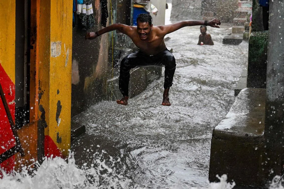 A man jumping through a flooded street during high tide near the sea front in Mumbai, India, on July 6.