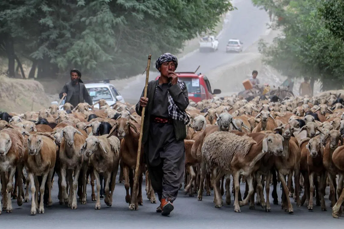 An Afghan sheep herder walking his sheep through a street in the Fayzabad district of Badakhshan province in Afghanistan on July 6.