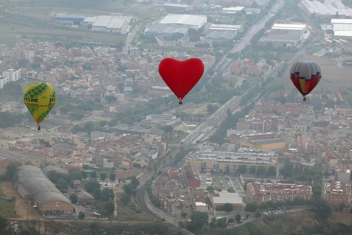 Hot-air balloons taking part in the European Hot Air Balloon Festival 2023 held in Igualada, Spain, on July 6. This festival is the largest one in Spain and one of the biggest hot-air balloon gatherings in Europe.