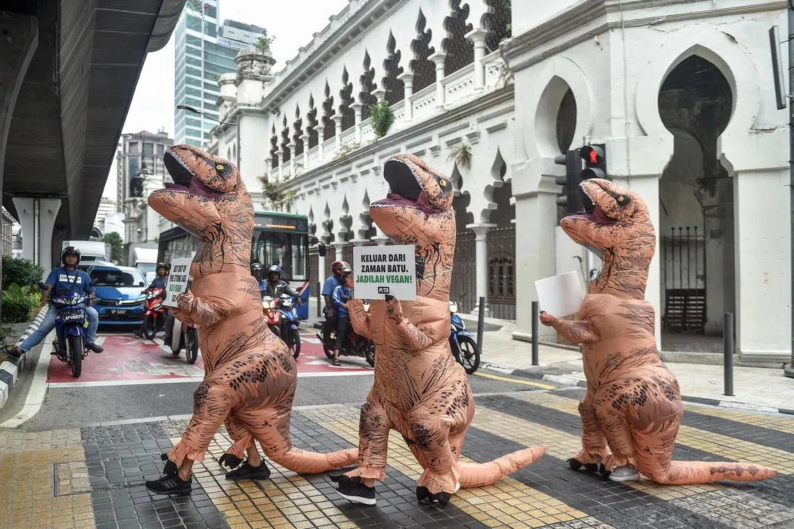 Activists with animal rights group People for the Ethical Treatment of Animals, or Peta, dressed up as dinosaurs carrying signs urging people to become vegan during a protest in Kuala Lumpur, Malaysia, on July 6.