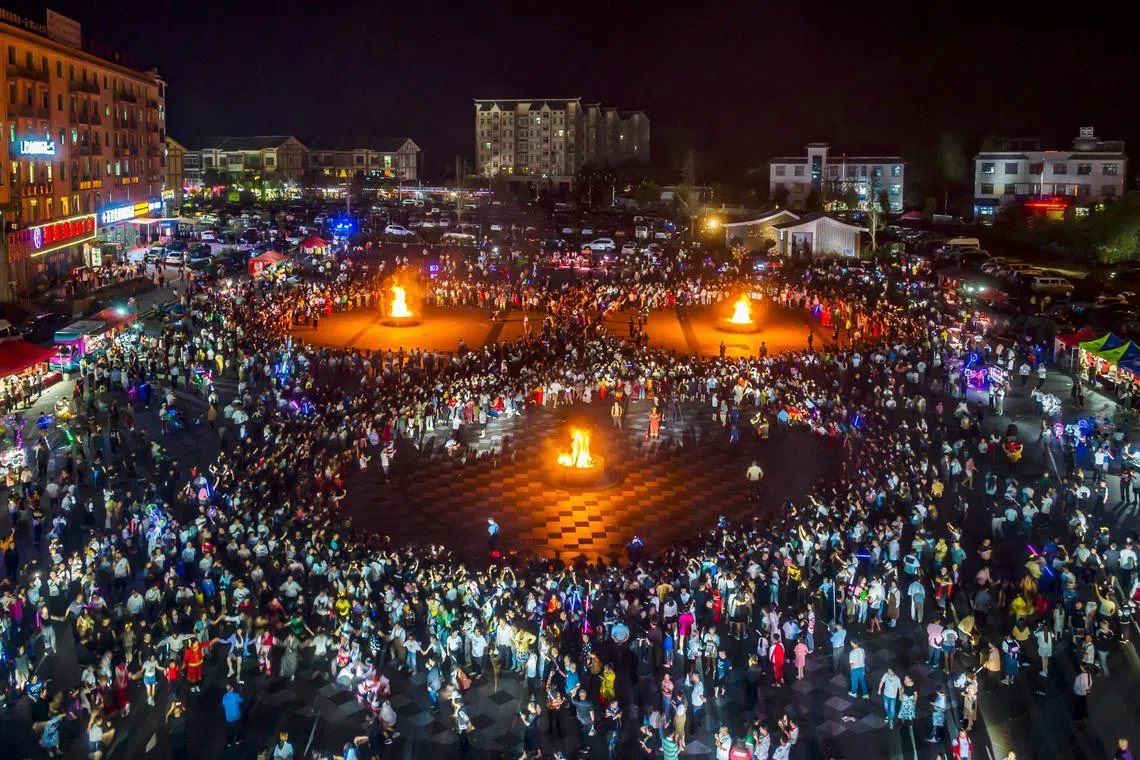 This aerial photo taken on July 5 shows tourists watching traditional street performances in Bijie, in China's south-western Guizhou province.