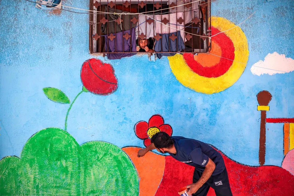 A man painting a mural on a wall ahead of the Muslim feast of Eid al-Adha at the Shati Camp for Palestinian refugees in Gaza City, on June 26, 2023.