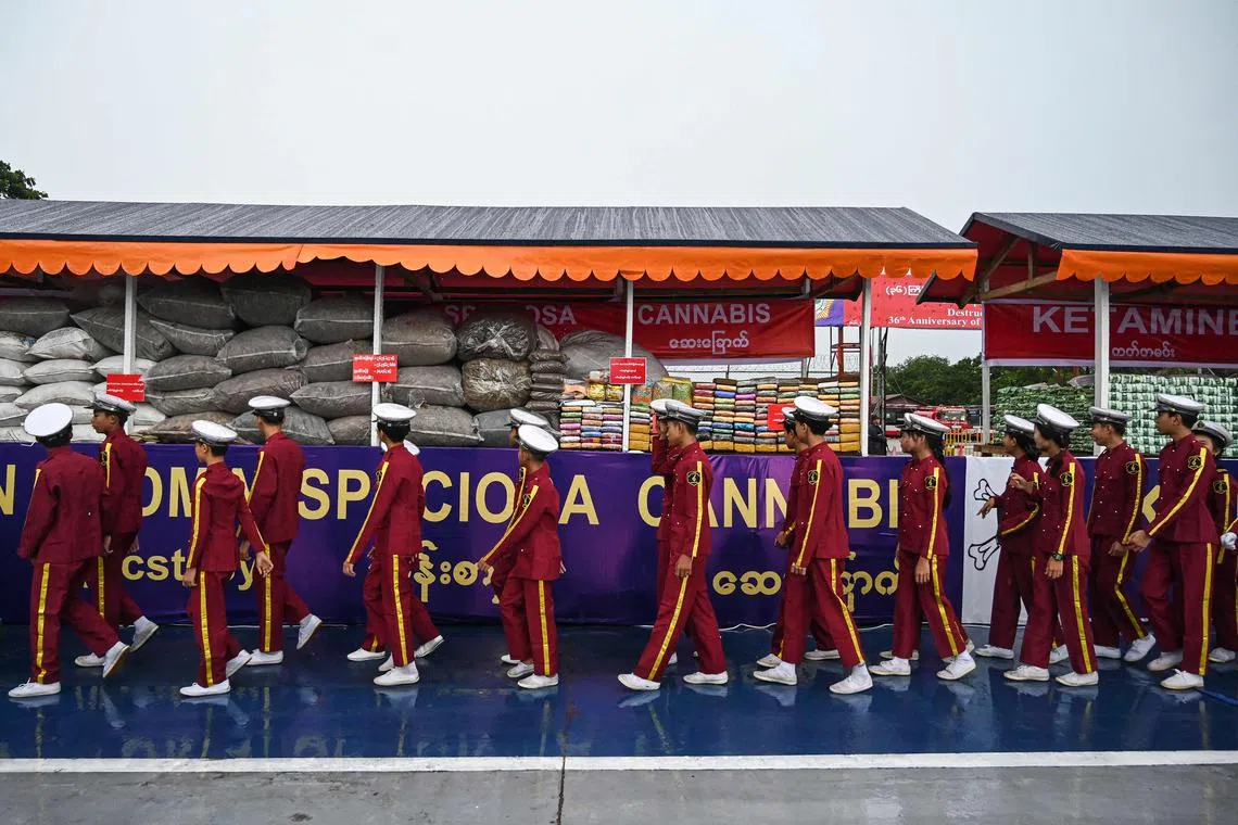 Students looking at a pile of seized illegal drugs at a destruction ceremony to mark the International Day against Drug Abuse and Illicit Trafficking, in Yangon, on June 26, 2023.