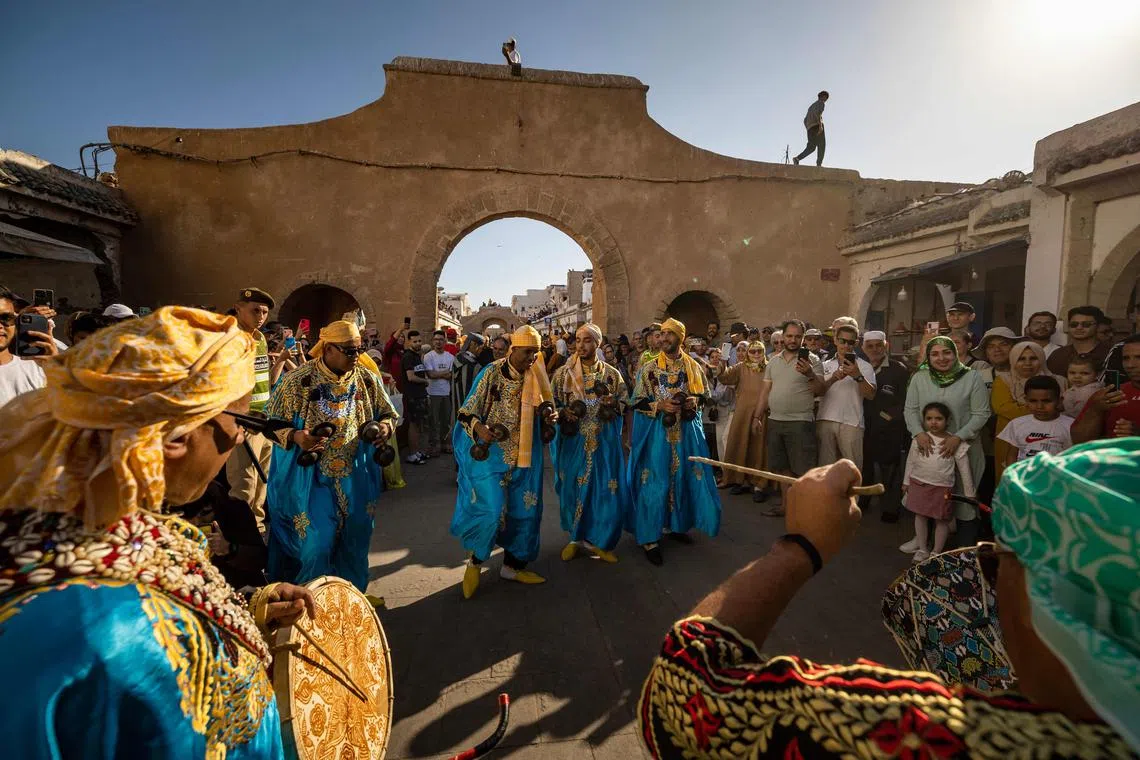 Members of a traditional Gnawa band parade along a streets during the opening ceremony of the 25th edition of the Gnaoua World Music Festival in Essaouira, Morocco, on June 27, 2024.