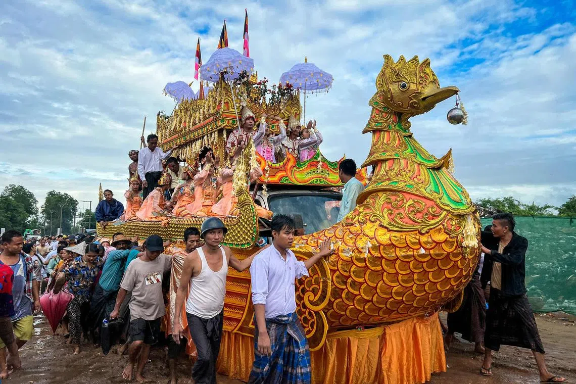 Participants carry the coffin of slain Buddhist abbot Sayadaw Bhaddanta Munindabhivamsa who was killed by Myanmar security forces in Bago, Myanmar, on June 27, 2024.
